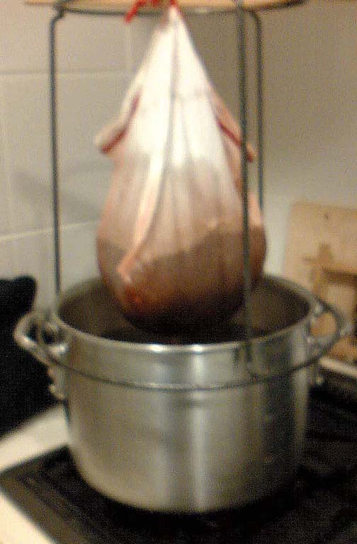 5火を止め、画像のような状態にセットし布袋に煮上がったりんごを入れる。(とても熱いのでやけどに注意)