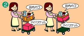 ?マイバスケットをカート車の下または店内カゴの下に重ねてお買物をします。