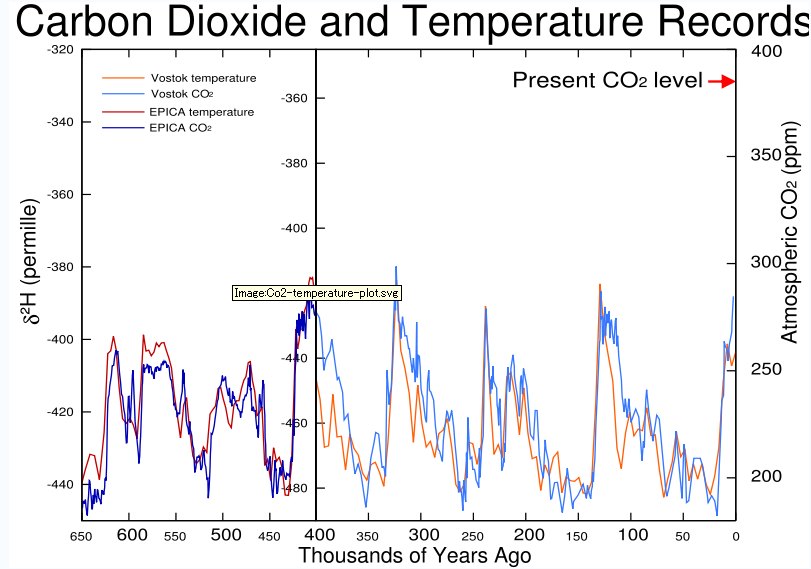 常にオレンジ色の気温変化が先行しており、それに伴って二酸化炭素が増加・減少しているのがはっきりわかります。