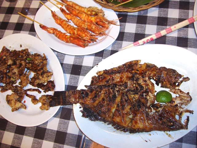 注文したのは、エビの串焼き、カニ、マナガツオに似た魚、アイナメに似た魚、葉っぱの炒め物、焼き鳥など