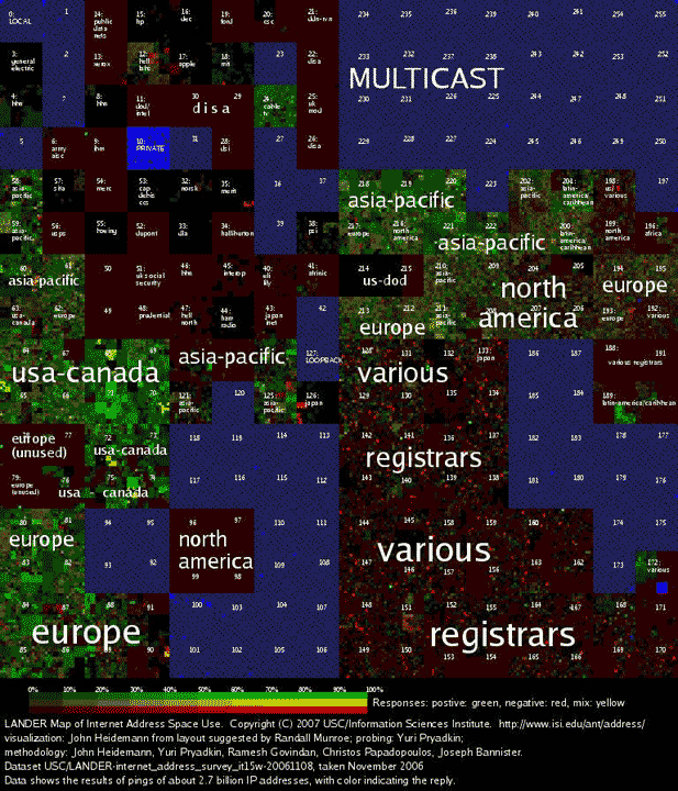 ISIの研究者らは、3台のコンピュータから28億以上のIPアドレスに、ping(エコー要求のインターネット制御通知プロトコルパケット)を送信し、通信が可能かどうかを調査した。すべてを送信するのに62日間かかったという。