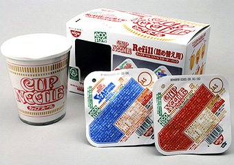 あのカップヌードルが詰め替え用、新発売。改正容器包装リサイクル法への対応とも取れますが、環境への配慮は、当然!の時代になった象徴でしょうか?食べ終わって捨てるとき、後ろ・・・