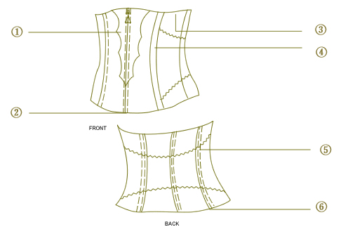 【ひきしまったウエストラインを引き出します】1 フロント部素材は伸びない素材のサテンとマーキゼットレースに光電子繊維からなる4重構造でスッキリサポートします。2 フ・・・