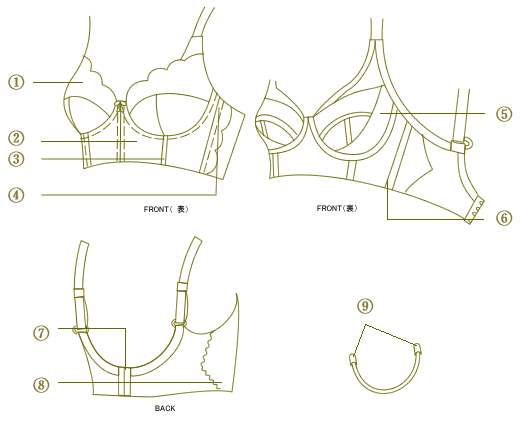 【バスト、ウエスト、ヒップの形を整えながらメリハリのあるボディをつくります】1 カップは丸みと高さを出す為、3枚接ぎの立体裁断にして厚みのあるしっかりしたカップ芯を使・・・