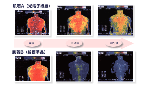 光電子繊維から放射される遠赤外線が人体の水分子に吸収され、その水分子の活動を活発にし、蒸発しやすくします。光電子繊維は、汗の蒸散スピードを早め、ムレを抑えて、いつもサラ・・・