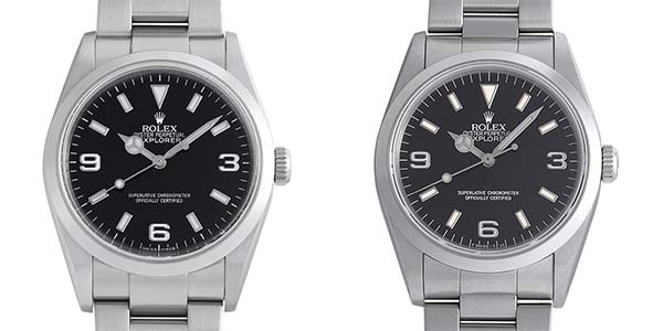 文字盤を細部まで見渡しても、両モデルの明確な違いは見つかりませんでした。ただ、ブレスレット部分をよく見比べると、違いが浮き彫りになります。左:114270 右:1427・・・